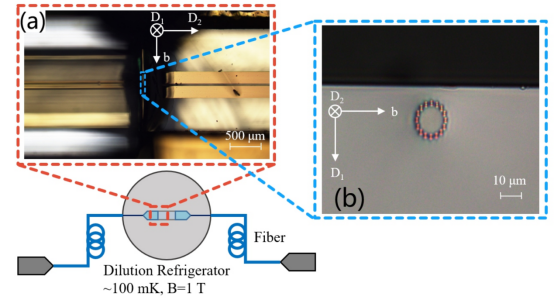 图1:光纤直连的通讯波段量子存储器。(a).光纤阵列与掺铒波导连接的局部细节图; (b).波导横截面的放大细节图。