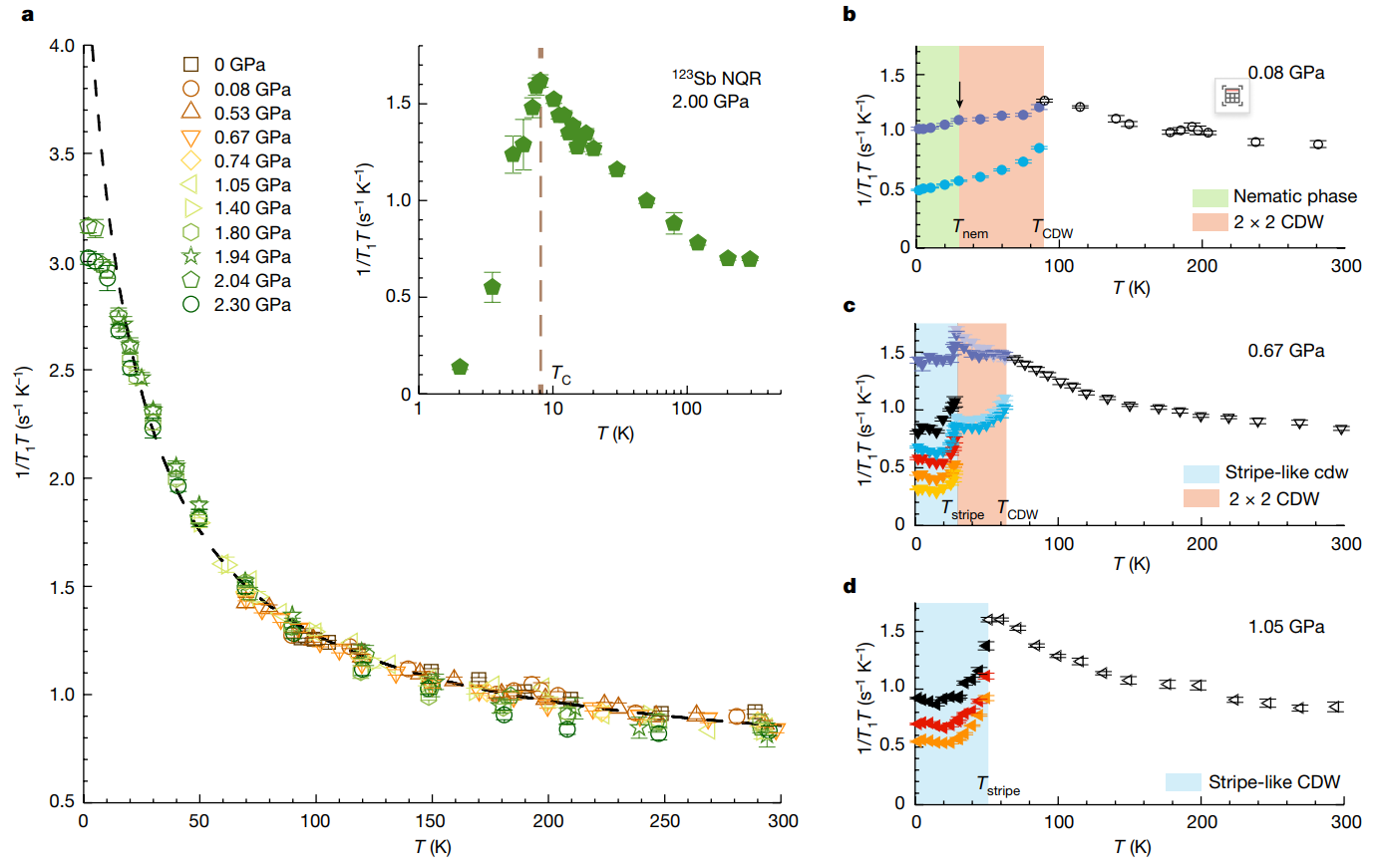 研究团队还通过测量原子核的自旋-晶格弛豫率发现当新的电荷密度波在压力下被完全抑制后,体系在低温下呈现出强烈的电荷涨落,表明笼目超导体具有显著的电子关联效应,这可能是来源于笼目晶格中电子-电子之间非局域的相互作用(如图3所示)。此外,在压力下的超导态与常压下的超导态具有显著不同的自旋-晶格弛豫率随温度的演化行为。传统超导体通常会在超导转变温度之下表现出一个特征的Hebel-Slichter相干峰,而这一特征在之前笼目超导体常压下的核磁共振研究中已被观察到,表明常压下的超导态是一种传统超导态。然而,中科大研究团队在压力下的核磁共振研究表明,压力下的超导态并没有表现出类似的Hebel-Slichter相干峰行为(如图3所示),这表明笼目超导体CsV3Sb5在压力下的超导态可能是一种非常规的超导态。
