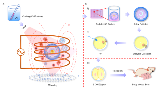 基于此,中国科大低温生物医学研究团队开发了基于协同抑冰策略的小鼠卵泡低浓度低温保护剂玻璃化保存方法。他们将磁热和光热空间复温与水凝胶微封装结合,实现了协同抑冰,将渗透性保护剂的浓度降低了75%(仅为原来的约1/4)。其中空间复温技术可有效提升复温速率和温度分布均匀性,抑制复温过程可能出现的反玻璃化/重结晶,避免过大的细胞损伤。水凝胶封装则既可提供关键生化和力学微环境的调控,有力支撑复温后小鼠卵泡的3D培养体外发育;又可提供结构仿生低温保护,减少毒副性低温保护剂的需求;还可以实现卵泡与外界磁热和光热材料的物理隔离,提高生物安全性。经此方法保存的卵泡,冷冻复苏后其存活率提高了约1/3;且其经体外3D培养后可成功排出成熟的卵母细胞,该卵母细胞进一步体外受精并移植到代孕小鼠体内可产下健康的子代小鼠。综上所述,该研究建立了一个集成了微封装、冷冻、复温和3D培养的一体化平台,为卵泡的保存和充分利用提供了一套独特的解决方案。