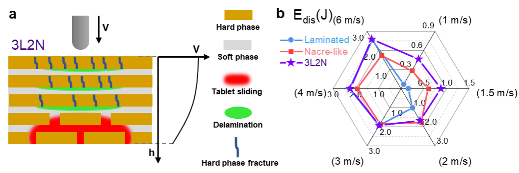 自然贝壳中的珍珠层具有高度规则的“砖块-灰泥”微结构,是天然的抗冲击盔甲,被视为新型抗冲击防护材料研发中的微结构设计模板之一。前人的研究工作表明仿贝壳结构在准静态或低速冲击加载下,可通过规模化的“砖块滑动”机制耗散大量的冲击能量。近日,中国科学技术大学倪勇教授、何陵辉教授研究团队发现仿贝壳结构在较高冲击速度下会丧失此类优异的抗冲击耗能机制,其性能弱于普通层状复合结构;基于此现象,进一步突破以往随机混合的耐冲击结构设计方案,提出一种利用不同结构来匹配冲击速率变化的混合结构抗冲击设计策略,为抗冲击性能优化的微结构仿生设计提供了新的思路。成果以 “Anomalous inapplicability of nacre-like architectures as impact-resistant templates in a wide range of impact velocities”为题发表在国际期刊《Nature Communications》。