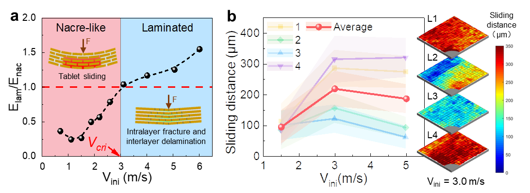 图2 冲击速度对仿贝壳结构抗冲击性能影响:(a)层状结构与仿贝壳结构耗能比值 (b)贝壳结构砖块滑动机制表征