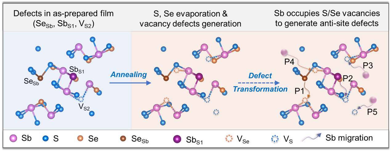 近日,中国科学技术大学化学与材料科学学院陈涛教授课题组在硒硫化锑点缺陷性质研究中取得进展。该团队通过深能级瞬态谱技术探测温度驱动的硒硫化锑点缺陷特性,再结合退火过程中材料组分变化,揭示其点缺陷的形成和演化机制。研究发现:初始水热沉积导致高形成能点缺陷的形成,这是在水热条件下驱动离子随机沉积的结果;后退火及薄膜的结晶过程导致硫和硒阴离子的损失并产生空位缺陷(VS(e));由于阳离子/阴离子反位缺陷形成能较低,锑离子迁移并填充阴离子空位,最终形成SbS(e)反位缺陷(如下图)。该缺陷演化机制为设计薄膜制备方法以抑制深能级点缺陷的形成提供了关键参考依据。相关成果以“Thermal-Driven Point Defect Transformation in Antimony Selenosulfide Photovoltaic Materials”为题发表于Advanced Materials。