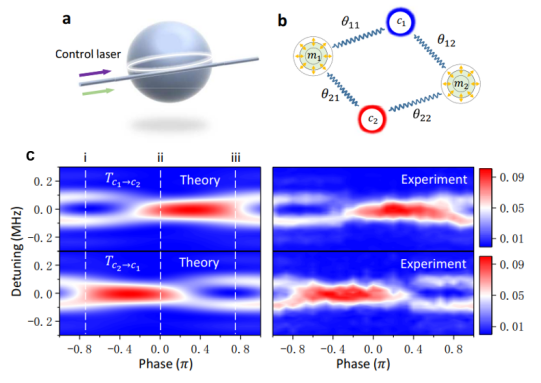 图注:a-b.光力微腔中四模式耦合;c.相位控制的非互易频率转换的理论和实验结果。