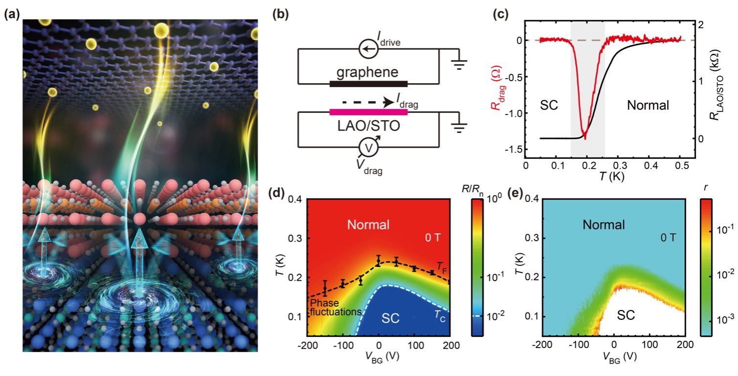 图示:(a)石墨烯与LaAlO3/SrTiO3界面超导间约瑟夫森-库仑拖拽效应示意图;(b)拖拽效应测量原理;(c)拖拽电阻与LaAlO3/SrTiO3界面电阻随温度的变化;(d)LaAlO3/SrTiO3超导相图;(e)拖拽电流耦合比对背栅和温度的依赖关系。