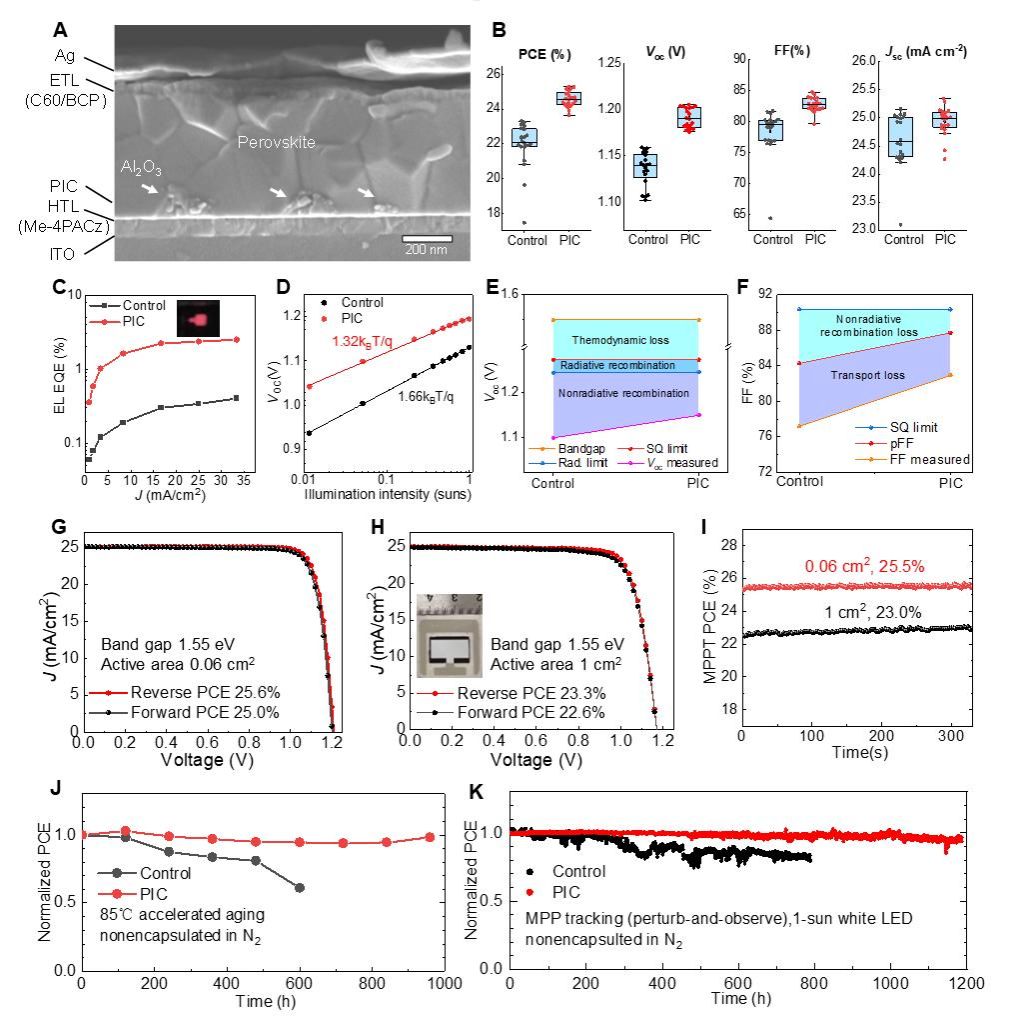 团队在叠层器件中广泛使用的p-i-n反式结构中开展了PIC方案的验证,首次实现了空穴界面复合速度从~60cm/s下降至10cm/s(图3),以及25.5%的单结最高效率(p-i-n结构稳态认证效率纪录24.7%)(图4)。这种性能的大幅改善在多种带隙和组分的钙钛矿中都普遍存在,展现了PIC广泛的应用前景。另外,PIC结构在多种疏水性基底都实现了钙钛矿成膜覆盖率和结晶质量的提高(载流子体相寿命大幅提升),对于大面积扩大化制备也很有意义。