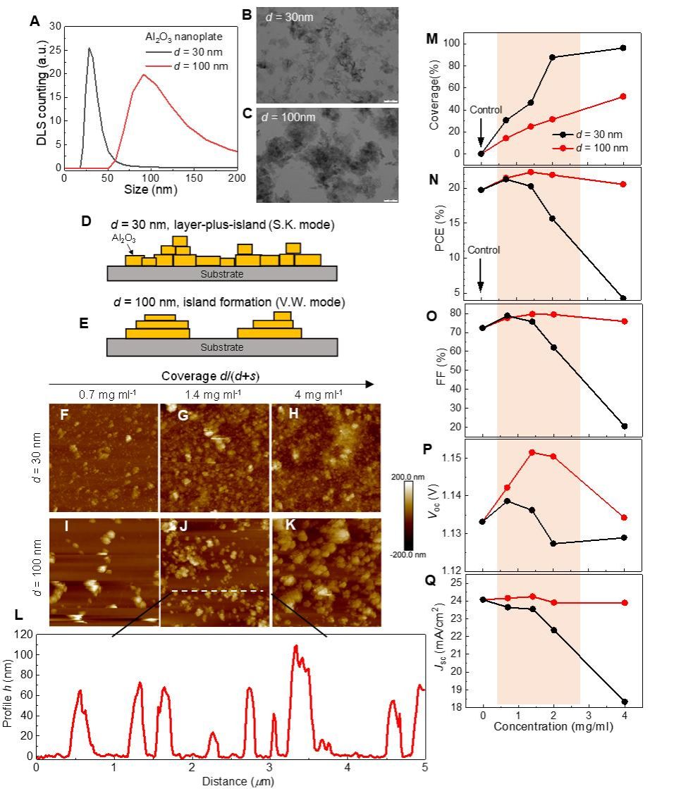 团队经过长期思考和大量实验探索,提炼出这种PIC接触结构方案(图1)。其主要思想是不依赖传统纳米级钝化层和遂穿传输,而直接使用百纳米级厚度的多孔绝缘层,迫使载流子通过局部开孔区域进行传输,同时降低接触面积。研究团队的半导体器件建模计算揭示了这种PIC结构周期应该与钙钛矿载流子传输长度匹配的关键设计原理。PIC方案与晶硅太阳能电池领域的局部接触技术有异曲同工之妙,但是不同的是,钙钛矿中的载流子扩散长度较单晶硅要短很多,从毫米级别大幅减小到微米甚至更短,这就要求PIC的尺寸和结构周期要在百纳米级别。传统的晶硅局部接触工艺不能够直接满足这种精度要求,而使用高精度微纳加工技术在制备面积和成本方面存在不足。对此挑战,团队巧妙利用了纳米片的尺寸效应,通过PIC生长方式从常规“层+岛”(Stranski-Krastanov)模式向“岛状”(Volmer-Weber)模式的转变,成功由低温低成本的溶液法实现了这种纳米结构的制备(图2)。