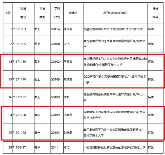 此次4个获评“特优”的项目分别是:王熹徽教授主持的2016年度国家自然科学基金面上项目《考虑匮乏成本的灾害应急物流供应链目标函数与协调机制研究》、苟清龙教授主持的2016年度国家自然科学基金面上项目《O2O环境下的供应链决策模型研究》、沈晓蓓教授主持的2017年度国家自然科学基金青年项目《限时服务下的电商供应链系统库存管理研究》、刘林冬教授主持的2017年度国家自然科学基金青年项目《非平衡博弈下的外生式大联盟稳定化策略研究》。