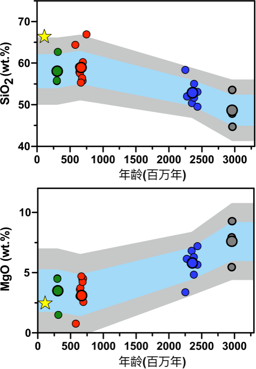 科研人员首先通过分析俯冲带钙碱性火成岩的V同位素组成,对比全球拉斑和钙碱性火成岩、太古宙绿岩带火成岩的数据,在排除磁铁矿过度结晶的样品后,发现火成岩的δ51V和SiO2以及MgO的相关性适用于太古宙的样品。为了探索大陆上地壳成分随时间的变化,该论文进一步测量了冰碛岩V同位素组成。冰碛岩常被用来研究大陆地壳组成,但是冰碛岩受到胶结物质以及风化改造的影响,其主量元素不能直接用来指示陆壳成分。作为国际上少数实现高精度V同位素测量的团队之一,黄方团队前期的研究表明,V同位素组成不易受到风化、蚀变改造的影响。冰碛岩的V同位素组成(图1)可用于直接计算其原岩的主量元素含量。结合得到的岩浆岩δ51V-SiO2-MgO线性关系与冰碛岩V同位素组成,重建了古老大陆上地壳成分(图2),发现在中太古代(距今~30亿年前)时大陆上地壳依然以镁铁质成分为主,而从镁铁质到长英质地壳的转变发生在距今~30亿年之后。这个成分转变可能标志着全球板块构造的开始,表明全球板块构造运动的启动不可能早于30亿年前。