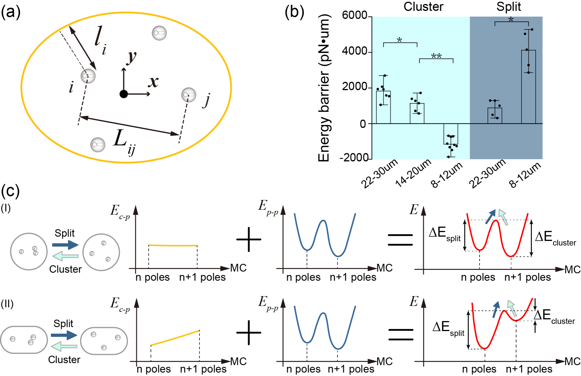 图4:理论模型揭示细胞形状调控纺锤体的劈裂与合并行为。(a)理论模型示意图。(b)计算并统计实验中的纺锤体劈裂与合并行为的能量势垒。(c)四面受限的力学环境调控纺锤体行为的机理。较宽的管道内细胞呈圆形,极与细胞皮层的距离较远,因此极与极之间的相互作用并不显著(I)。而较窄的管道内细胞呈细长形,极与皮层的平均距离较近,因而使得极与极之间的相互作用变得显著,进而增大纺锤极劈裂的能量势垒,同时也减小纺锤体合并的能量势垒(II)。