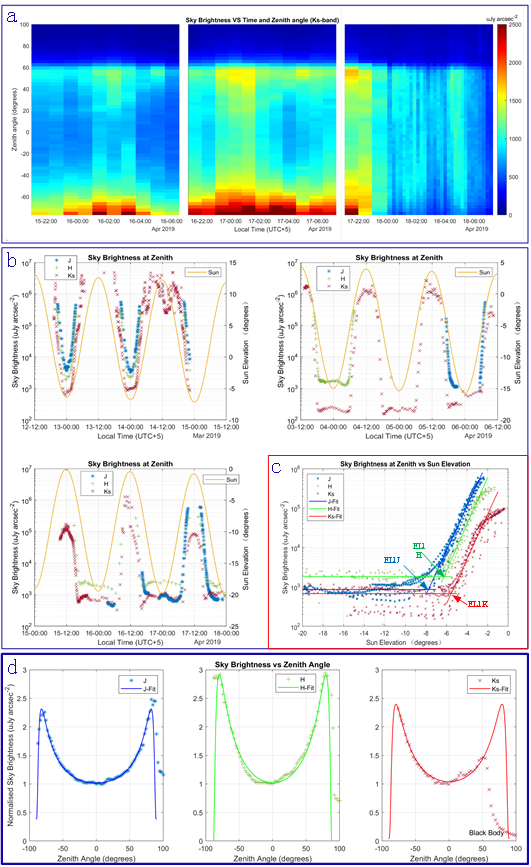 团队针对NISBMfor Dome A获得初步南极观测数据,进行了仔细细致的分析。分析结果如图2所示,a中展示了DOME A白昼到极夜过渡过程中,Ks波段在-80°~100°观测角度上原始天光背景强度的时域变化情况;b中分析了J,H,和Ks波段天顶角(90°)天光背景强度与太阳高度角随时间变化的关联性;c中解析了J,H,和Ks波段进入黑夜时太阳高度角的差异性,即:当太阳高度角降低到某个特定拐点后,该波段的天光背景强度将不再受太阳影响,J,H,和Ks的拐点分别为:EL1J=-7.8°,EL1H=-6.2°,EL1K=-5.5°;d中根据理论公式对J,H,和Ks波段观测数据进行了拟合,很好地符合了理论结果。