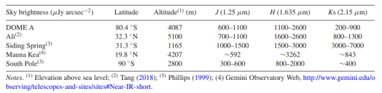 通过对天顶角数据的计算分析,南极DOME A在J,H,和Ks波段的天光背景强度分别为:600 ~ 1100μJy arc sec?2,1100 and 2600μJy arc sec?2,200~900μJy arc sec?2。对比低纬度高海拔地区的观测站(如表1所示),DOME A在Ks波段亮度明显降低,与南极点(SP)相当。这表明DOME A是进行Ks波段天文观测的绝佳地点。
