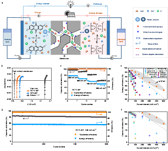 3.以微孔框架离子膜为隔膜组装的水系有机液流电池(蒽醌/铁氰化钾体系,图4a),膜面电阻仅为0.17 Ω·cm2(图4b)。该电池具备优异的倍率性能(图4c),其充放电电流密度可高达500 mA cm-2(当前文献报道均普遍≤100 mA cm-2),且在高电流密度下循环充放电中保持稳定(图4d)。该膜实现了水系有机液流电池快充,在不同电流密度下的电池的能量效率和容量利用率均显著高于文献报道值(图4e,4f)。研究者也拓展了该研究成果,实现了中性体系液流电池的快充。