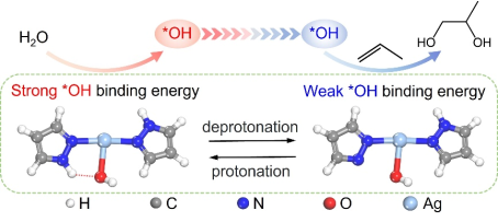 1,2-丙二醇是一种理想的化工原料,其广泛应用于生产不饱和聚酯树脂、药品和防冻剂等。1,2-丙二醇的传统制备方法经历丙烯氧化制环氧丙烷以及环氧丙烷水解两步过程。在传统制备过程中需使用高污染的氯气作为氧化剂,且环氧丙烷水解需在高温或强酸性环境下进行。相比之下,一步法丙烯电催化氧化制1,2-丙二醇不仅可以简化制备工艺,且反应以水为氧源,避免了氯气的使用,进而有效缓解传统工艺中高污染、高能耗等诸多问题。对于丙烯电催化氧化制备1,2-丙二醇的反应过程中,氧物种*OH的生成以及氧物种*OH与丙烯的耦合为两个关键步骤。其中催化剂对氧物种*OH的强吸附有利于水解离为*OH,而对氧物种*OH的弱吸附则有利于丙烯与*OH的耦合。这种氧物种*OH的生成和后续与丙烯耦合过程使得氧物种*OH在催化剂表面的吸附能存在线性标度关系,极大限制了丙烯电催化氧化制1,2-丙二醇的催化活性。