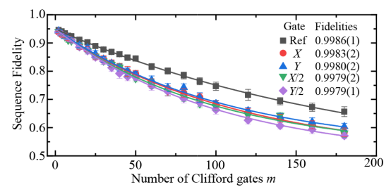 图2 单比特短路径非绝热几何相位门的插入式随机基准测试结果。
