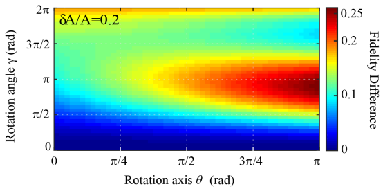 图3 固定的拉比频率误差下,单比特短路径非绝热几何相位门的操作保真度与传统动力学门的操作保真度在全参数空间比较,单比特短路径非绝热几何相位门均优于传统动力学门。