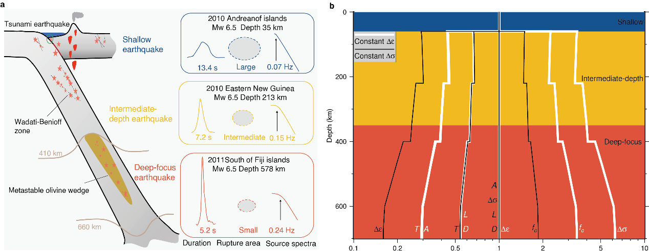 深地震是指震源深度超过60公里的地震。由于地球深处高温高压,岩石表现出塑性形变,深地震的产生机制与浅地震的脆性破裂有所不同。关于深地震成因有许多猜想,如脱水脆化、热失稳和亚稳态橄榄石相变等,但至今仍没有定论。了解深地震的成因和破裂过程有助于我们更好地理解地震的物理机制、俯冲带的性质以及地球内部的动力过程。长久以来,地震学家通过分析震源时间函数,发现浅源地震(0-60 km)、中源地震(60-300 km)和深源地震(300-700 km)具有不同的破裂特征,并根据这些差异推断深地震可能的产生机制。