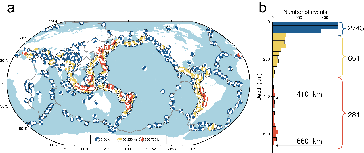图1. 全球震级>5.5级的浅、中深和深源地震分布