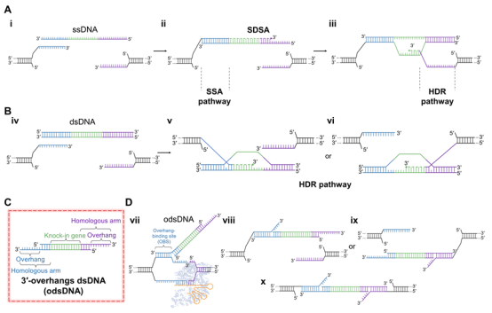 图1(A)ssDNA供体基因敲入的机理;(B)dsDNA供体基因敲入的机理;(C)odsDNA的结构;(D)odsDNA供体基因敲入的机理。