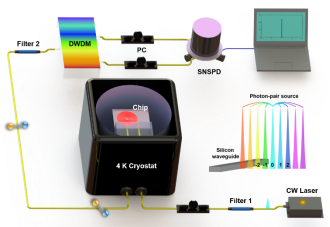 光量子集成芯片,以其极高的相位稳定性和可重构性,逐渐发展成为展示新型量子应用、开发新型量子器件的理想平台。目前大多数光量子集成器件聚焦于室温条件下的功能,但许多量子元件(如超导纳米线单光子探测器)和半导体、超导量子计算系统,都需要在低温条件下运行。为了实现光量子系统的全片上集成和光互联不同量子计算系统构建量子网络,低温非线性过程研究不可或缺。研究组将集成微纳硅波导置于低温腔中,研究了4 K—294K温度下硅波导中的自发四波混频过程,并基于该过程实现了低温集成量子纠缠光源的制备。