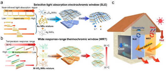 图1.智能窗户的构筑和调制机理示意图。a. 基于一维电致变色W18O49纳米线、导电Ag纳米线和Au纳米棒共组装的选择性光吸收电致变色智能窗户(SLE)。b. 基于不同W掺杂量的W-VO2纳米线共组装的宽响应范围的热致变色智能窗户(WRT)。c. 在施加电压或环境温度的刺激下,智能窗户对于太阳光的调控和室内温度的控制。
