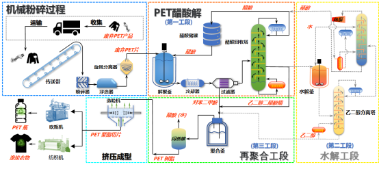乙酸化学解聚实现废弃PET闭环循环的示意图