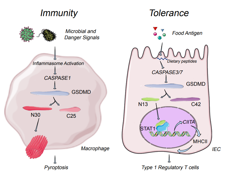 图1:GSDMD分子在不同细胞中应对病原以及食物抗原,通过产生不同的剪切形式,上膜打孔或入核参与转录分别诱导免疫激活或免疫耐受,体现了同一个免疫分子的功能两面性。