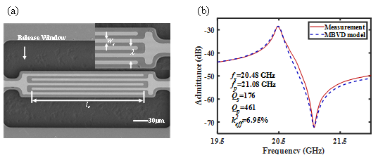 图2、A3超高频高耦合声波谐振器 (a)谐振器SEM图像,(b)谐振器测试导纳曲线