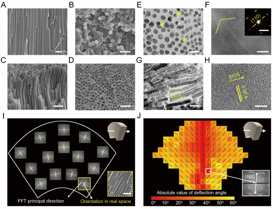 图2(A)FFR在纵向上的自然断面扫描图;(B)FFR在横向上的自然断面扫描图;(C和D)FFR脱钙处理之后的扫描图;(E和F)文石纳米线中的孪晶结构透射电子显微图片;(G和H)文石纳米线沿长度方向上的晶体学特征;(I和J)整个FFR中纳米线在形貌上和晶体学上的取向分析示意图。