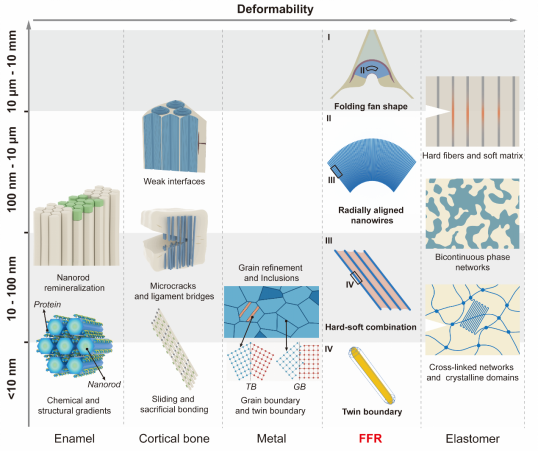 图3 典型生物和人工结构材料的耐疲劳设计机制。FFR中所具备的跨尺度结构特征使其在可变形能力上明显优于典型的生物矿物如牙釉质和骨骼,与常见的人工弹性体材料相比,FFR也一定程度保持了其高硬度和刚度。