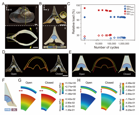 图1(A)褶纹冠蚌和截面照片;(B)铰链切片照片和CT重构图;(C)在正常开合和过载状态下的疲劳测试结果;(D)开合前后铰链各区域形状变化及其轮廓图;(E)有限元模型对应的开合前后的铰链各区域形状变化及其轮廓图;(F)铰链有限元分析模型示意图;(G)开合状态下铰链各区域周向应力分布;(H)开合状态下铰链各区域径向应力分布。