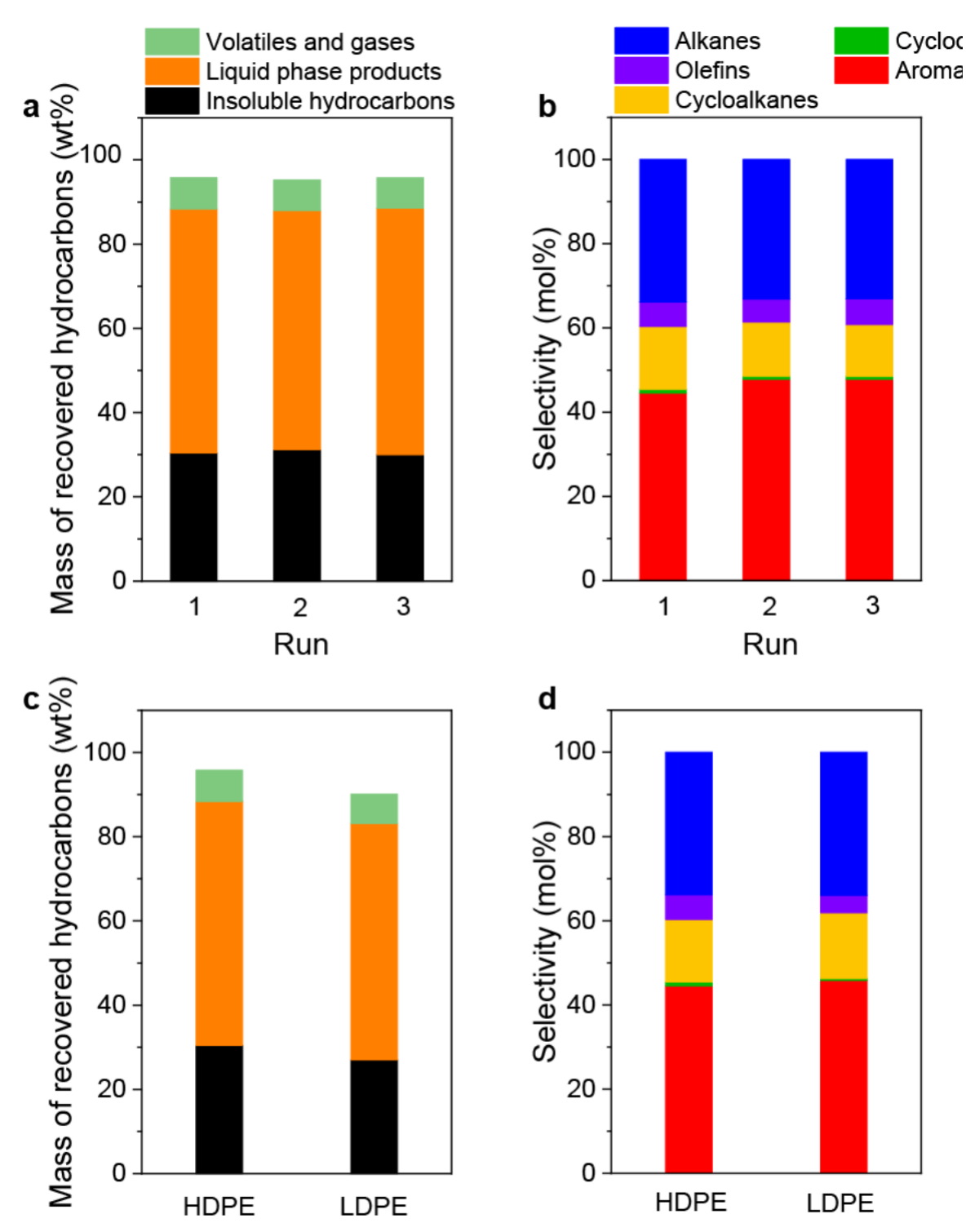 在无需额外添加氢气或溶剂的条件下,研究人员实现了高密度聚乙烯塑料到环状烃的循环升级。具体来讲,在Ru/HZSM-5催化剂的作用下,经280摄氏度24小时的催化反应,高密度聚乙烯塑料的转化率达到69.6 wt%(图1)。产物中链状烃主要分布在C1-C6,环状烃主要分布在C7-C16,且环状烃的选择性为60.3 mol%。