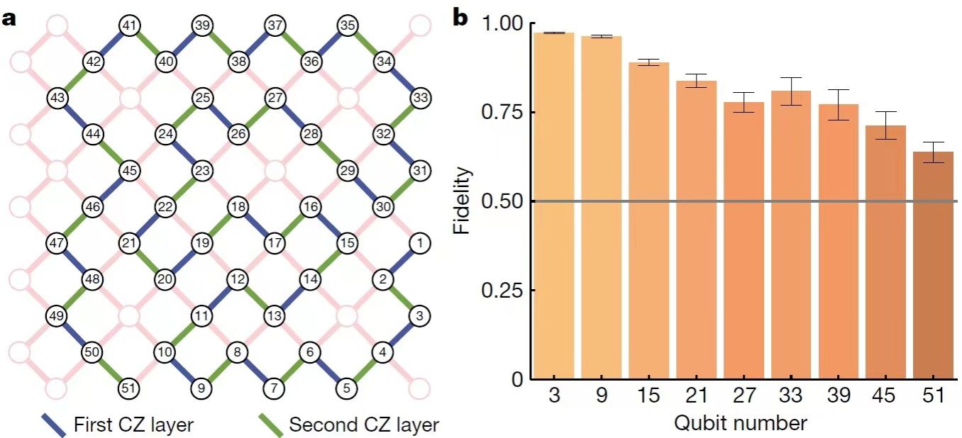 图2 利用“祖冲之二号”完成的51比特一维簇态制备的线路及量子态保真度结果。