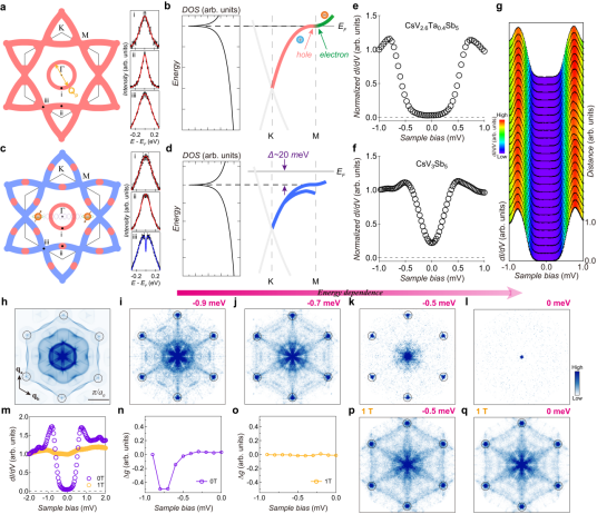 理论上,笼目材料中的超导和电荷密度波都可能与电子结构中的范霍夫奇点密切相关。在电子结构中,范霍夫奇点连接了空穴型与电子型能带,是能带结构中的鞍点,可以产生发散的电子态密度。一方面,范霍夫奇点附近巨大的电子态密度能够引起电子结构强烈的不稳定性,从而可能成为驱动电子有序态形成的源泉(如超导、电荷密度波);另一方面,范霍夫奇点处同时存在空穴型与电子型导电,可以形成一种等效的电子吸引作用,从而导致非常规配对机制的超导。然而,在现实材料中,范霍夫奇点往往偏离材料的费米能级,从而对材料的低能电子态影响非常小。同时,由于范霍夫奇点产生的电子不稳定性往往与材料的晶格不稳定性共存,进而很难区分两者的影响。因此,亟需寻找合适的笼目晶格材料体系,探索并厘清范霍夫奇点对超导及电荷密度波的作用。
