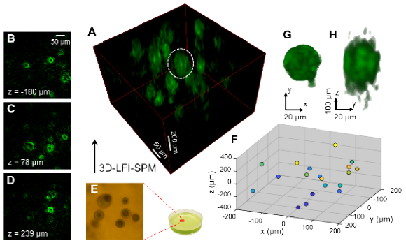 研究团队将该新型成像技术称为基于三维空间光场照明的单像素显微术(3D light-field illumination single-pixel microscopy, 3D-LFI-SPM)并搭建了原型显微镜。该单像素显微镜(0.1数值孔径)能够在390×390×3800μm3视场范围内以接近衍射极限的光学分辨率,2.7-μm的横向分辨率和~37-μm的轴向分辨率,对物体的光吸收分布进行精确的三维成像。团队采用3D-LFI-SPM成功实现了对藻类活细胞的无标记体成像,并基于此实现了细胞的空间原位计数。未来3D-LFI-SPM可拓展至多光谱成像领域,具有重要的生物医学功能成像应用前景。