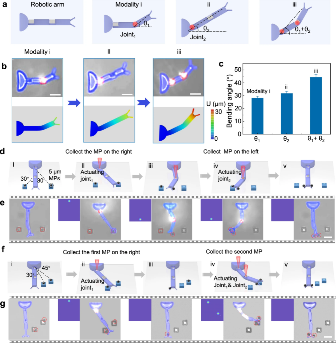 作为一个典型的示例,八个微关节被集成在一个人形微机械上。随后,利用空间光调制技术在3D空间内实现多焦点光束,进而精确地刺激每一个微关节。多个关节之间的协同变形促使人形微机械手完成多个可重构的变形模态。最终,在微米尺度下实现了“舞动的微机器人”(图2)。