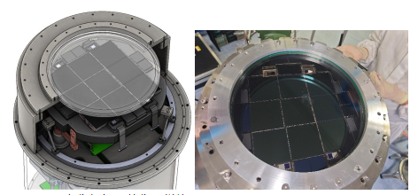 相机研制团队在WFST望远镜副总设计师、中国科学技术大学物理学院核探测与核电子学国家重点实验室王坚教授领导下,进行了主焦相机关键技术的攻关,包括探测器真空低温封装,大靶面探测器高精度测量和拼接,探测器低噪声低功耗读出和驱动,高效相机控制等。对于大靶面探测器高精度测量,研制团队攻克了低温工况下高精度平面度非接触测量的难点,基于激光三角测量法提出了适合于传感器低温封装工况下的差分三角测量方法(Differential Triangulation Measurement),在真空封装下的测量误差不超过0.5%,重复测量精度能达到±2μm。并在此基础上完成DTS测量仪的研制(如图2所示),并最终完成WFST主焦相机低温工况下的测量,如图3所示。目前WFST主焦相机已经完成研制,运往冷湖和望远镜本体进行安装和联调联测。