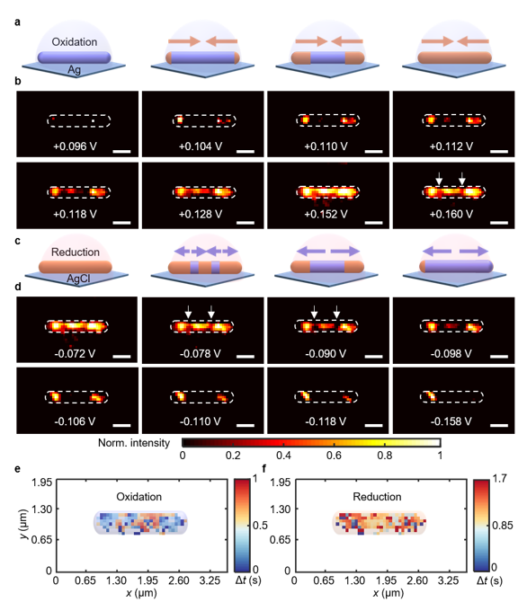 针对上述挑战,研究团队研发了高分辨等离子体散射干涉成像技术,通过调制入射光有效消除了反射光的干扰,实现了具有高空间分辨率和高抗干扰能力的表面等离子体散射干涉成像。以银的表面化学反应为例,研究团队原位追踪了溶液中单根银纳米线的动态电化学转化过程,在空间上刻画了纳米线反应动力学分布,为建立纳米线表面缺陷、重构与反应活性的关系提供了关键证据。该免标记成像分析方法,可以与电子显微镜等技术耦合表征纳米材料的结构和化学组成,为高分辨原位成像分析污染物的催化转化动态过程和解析其构效关系提供了有效的分析方法与技术平台。