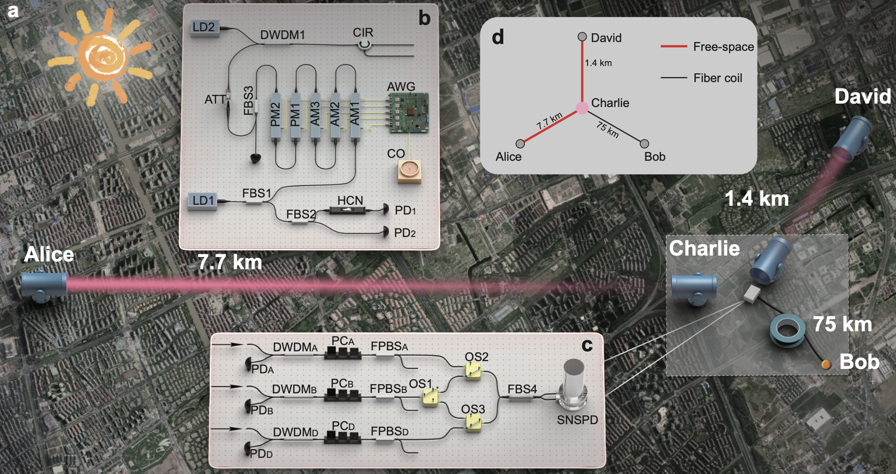 近日,中国科学技术大学潘建伟及其同事彭承志、曹原等与清华大学王向斌,中国科学院上海微系统所尤立星等人合作,首次在国际上实现了远距离测量设备无关的自由空间-光纤混合量子密钥分发网络实验,并此基础上完成了白天高背景噪声条件和卫星-地面多普勒频移补偿等验证。相关成果于2023年9月6日(北京时间)在线发表在国际学术期刊《物理评论快报》杂志上 [Phys. Rev. Lett. 131, 100802 (2023)]。这项成果全方位验证了星地间测量设备无关量子密钥分发(MDI-QKD)的可行性,向基于卫星的全球化、高安全性量子通信网络迈出了重要一步。