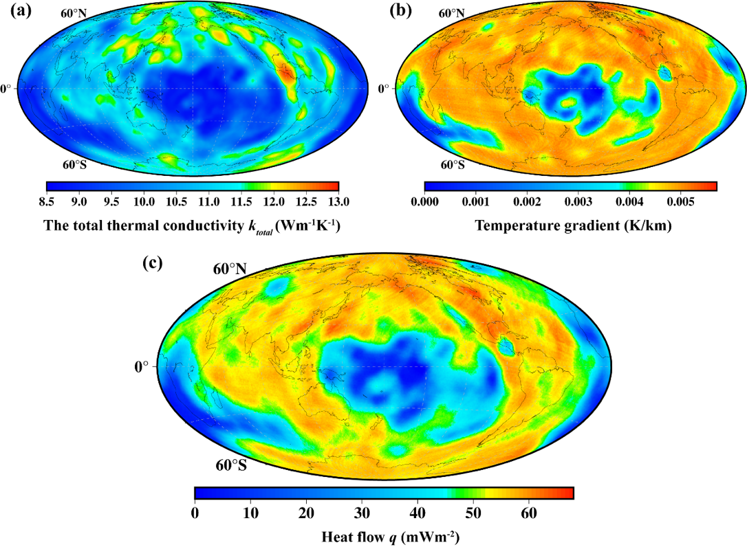图2.(a)核幔边界热导率分布;(b)核幔边界温度梯度分布;(c)核幔边界热流分布。