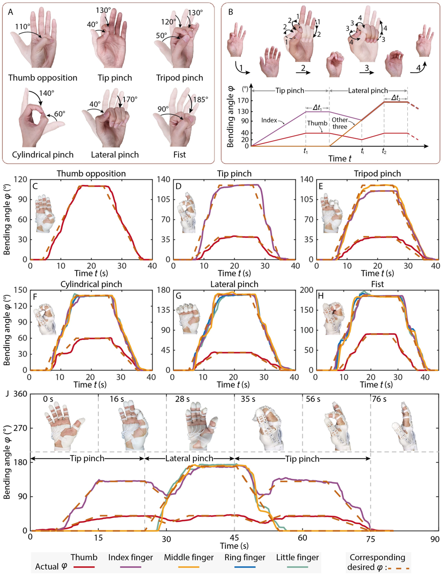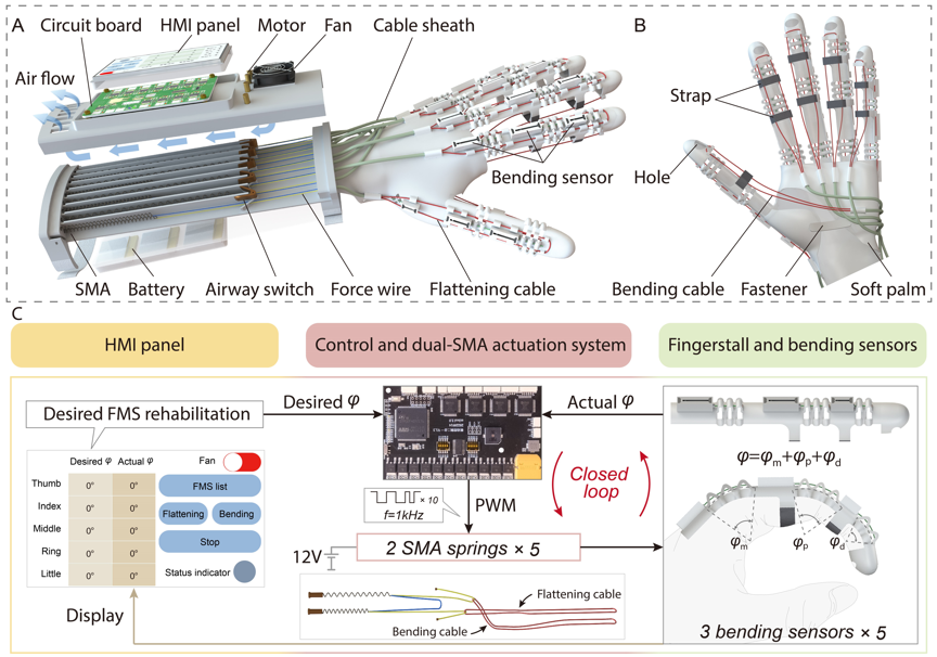 全球手功能障碍患者群体日益庞大,仅因脑卒中每年新增近千万人。由于指间协调性、肌张力等异常,患者失去手部精细动作技能。重复与持续的手部运动训练可刺激大脑皮层与神经元,达到手功能康复目的。柔性康复手套具有轻质本体、柔顺运动等优势,可突破传统刚性手套安全冗余度低等缺点。但由于柔顺本体易发生大形变不利于运动感知,以及多传感及驱动集成极易使手套繁冗不利于便携化等原因,现有柔性康复手套多数仅能实现基于开环控制的康复运动,使得手部精细运动技能精准康复仍极具挑战。