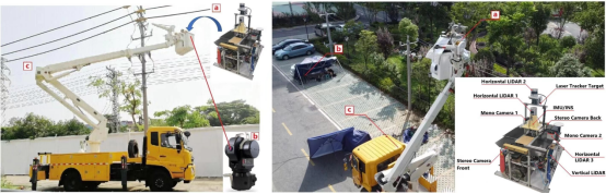 高空作业在工农业生产和日常生活中发挥着重要作用,但同时也伴随着较高的作业人员安全风险。推动高空作业的自动化和智能化发展将有助于保障作业人员人身安全,提高作业效率和质量,具有重要的社会价值和经济效益。研究团队展示了将自动驾驶感知系统与斗臂工程车相结合以创建多功能自主高空作业机器人平台的潜力。USTC FLICAR数据集的数据采集系统配备了各种校准良好且时间同步的传感器:四个3D激光雷达、两个立体相机、两个单目相机、惯性测量单元(IMU)和一个GNSS/INS定位系统。同时使用激光跟踪仪记录毫米级精度的地面坐标系下机器人平台实况位置。