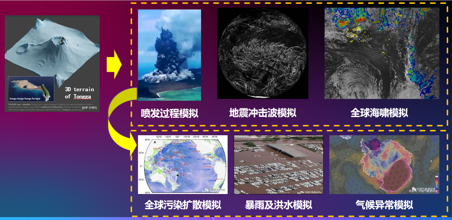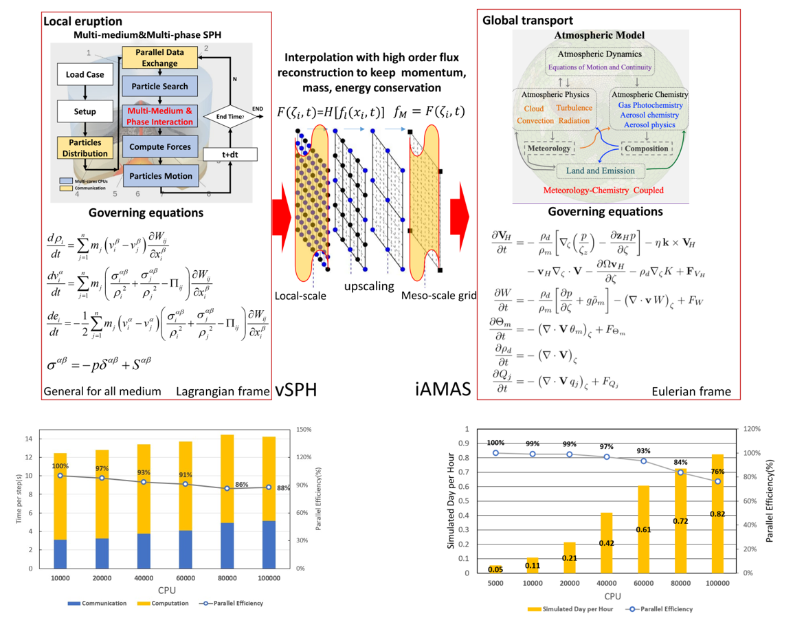 本研究将多介质多相界面运动光滑粒子动力学建模方法(vSPH)与高分辨率大气物理和化学全耦合建模方法(iAMAS)有机结合,自主设计了vSPH/iAMAS软件,建立了一套从局部10米到全球3公里超高空间分辨率的火山喷发和大气环流跨圈层的模拟系统,在新一代神威超级计算机上,使用39,00万个处理器核,在100公里×100公里×60公里的区域内对汤加海底火山喷发与大气环流的全过程进行了模拟,捕捉了火山爆发从冲击波、地震、海啸、蘑菇云到随后6-7天火山灰和水汽的运动扩散,初步获得了由火山喷发产生的地震活动以及同时发生的海洋和大气现象全耦合的相互影响效应。首届戈登·贝尔气候建模奖委员会主席John Taylor认为:本研究工作标志着研究地质构造过程与气候变化相互作用的能力取得了重大突破,为应对未来类似的全球性自然灾害事件提供了开发模拟和预警系统的方法。