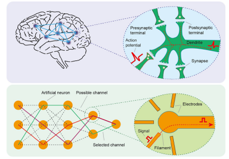 类脑神经元器件,即通常所说的类脑芯片,是指利用神经形态器件去模拟人脑中的神经元、突触等基本功能,再进一步将这些神经形态器件联结成人工神经网络,以模拟“大脑”的信息处理和存储等复杂功能。二氧化钒(VO2)作为典型的氧化物量子材料,在近室温附近具有可逆的绝缘-金属相变,是制备高开关比突触器件的理想材料。本研究中课题组研究人员基于近十年VO2的研究基础,利用氧化物分子束外延设备克服了高纯相结构的单晶二氧化钒薄膜的制备瓶颈,生长了高质量二氧化钒外延薄膜,并通过微纳加工制备了生物神经元和突触阵列,实现了电场调制和激光诱导下多通道VO2双端器件的选择性电路导通,从而直接模拟了神经元之间的突触动态连接过程。这种突触之间的连接体现在VO2导电丝的形成和空间位置的选择性,并直接受到外加电场和作为外加刺激的激光信号的调制。