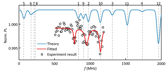 上图为纳米金刚石模拟生理原位条件时,实际进行的实验示意图。下图中,圆点为运动的单个纳米金刚石探测到的氧钒离子顺磁共振谱,红线是对实验数据进行拟合的结果,蓝线为理论模拟结果。