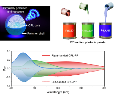 图1. 手性核壳微球的结构及其圆偏振发光示意图;RGB圆偏振发光光子涂料;圆偏振发光光谱。