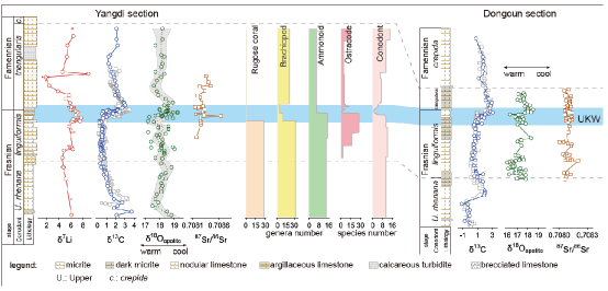 发生在泥盆纪晚期弗拉斯阶(Frasnian)-法门阶(Famennian)之交(约372 Ma)的F-F生物灭绝事件是地球迄今以来的五大生物灭绝事件之一,该事件导致了约80%的海洋无脊椎动物的灭绝。近期,中国科学技术大学肖益林教授的研究团队与中国科学院南京地质古生物研究所及合肥工业大学合作,对华南桂林地区两个典型的晚泥盆世海相碳酸盐剖面(杨堤剖面和垌村剖面)进行了系统的Li-C-Sr同位素研究,并以此制约了生物灭绝事件的发生机制,研究成果以“Carbonate lithium isotope systematics indicate cooling triggered mass extinction during the Frasnian-Famennian transition”为题发表在地球科学国际一流期刊Global and Planetary Change上。
