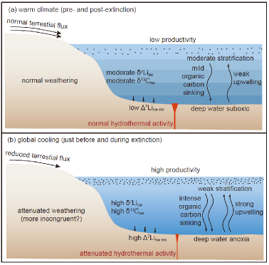 图2泥盆纪F-F界限附近由于全球变冷导致的地表环境变化及海水C-Li同位素响应。