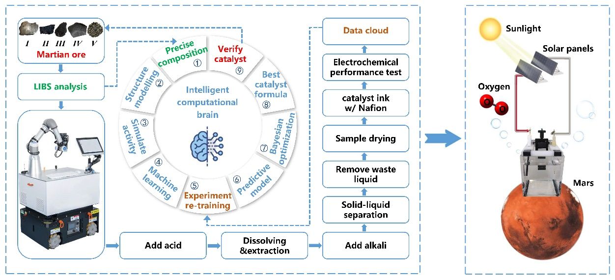 移居火星,是人类的梦想!然而,首先要克服的是缺乏氧气的火星环境。火星上存在水资源的可能,为利用太阳能驱动的电催化析氧反应制备氧气提供了机遇,由于人类无法在无氧的火星环境下长期生存,在火星上就地取材创制催化剂成为一个难以逾越的屏障。近日,中国科学技术大学罗毅教授、江俊教授、尚伟伟副教授团队与深空探测实验室张哲研究员等合作,采用中国科大机器化学家“小来”平台,高效融合人工智能和自动化机器实验,利用火星陨石制备出实用的产氧电催化剂,在2个月内就完成需要穷举2000年才能完成的复杂优化工作。这一具有里程碑意义的研究成果以“Automated synthesis of oxygen-producing catalysts from Martian meteorites by a robotic AI chemist”为题发表在国际期刊《自然·合成》上(Nature Synthesis),并被编辑选为当期热点论文予以专门推荐.