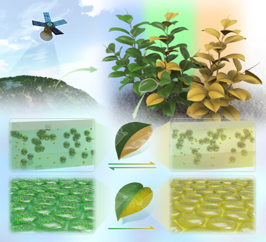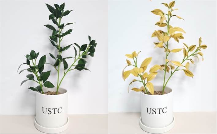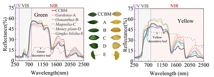 植被是典型的地面背景,针对植被的高光谱材料一直是工程领域的重点和难点:一方面,植物叶片具有独特的太阳光谱反射特征,材料需要在整个太阳光谱内与叶片光谱特征一致;另一方面,植物叶片的颜色及光谱特征会发生变化,材料需要具备变色能力。近日,中国科学技术大学工程科学学院研究团队针对上述难题,基于仿生思想研制了一种新型高光谱变色材料(图1)。该材料能模仿落叶植被在绿色和黄色之间的变色现象,且在两种色态下均能复现植物叶片的太阳光谱反射特征。相关研究成果以“A Color-Changing Biomimetic Material Closely Resembling the Spectral Characteristics of Vegetation Foliage”为题在线发表在材料领域知名期刊《Small》。