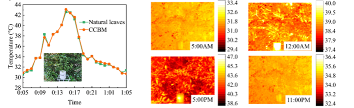 在实现变色现象的基础上,团队进一步通过发展颗粒系辐射传输模型设计材料中的颜料颗粒配比使其模仿叶肉细胞中细胞堆叠结构对入射辐射的散射过程,从而形成与真实叶片一致的近红外高反射特征;借助具有亲水特性的基材使仿生材料吸收空气中的水分,从而模拟植物叶片的水吸收谷特征(图3)。此外,仿生材料还可随环境中湿度波动进行水分吸附和脱附,模仿植物叶片通过水分输运进行温度调控,与天然叶片的红外特征一致(图4)。该研究实现了针对落叶植被的高光谱变色仿生,在工程领域具有广阔的应用前景。